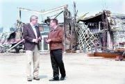 總理哈珀周五與阿省省長斯特默在奴湖鎮(zhèn)視察災(zāi)情交談。