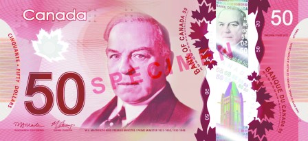 50元新紙幣的圖樣則顯示加國(guó)海岸保衛(wèi)船Amundsen號(hào)﹐反映加國(guó)于北極研究的領(lǐng)先地位﹔兩次任加國(guó)總理的William Lyon Mackenzie King也繼續(xù)保留于該紙幣正面。