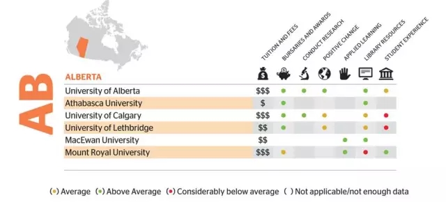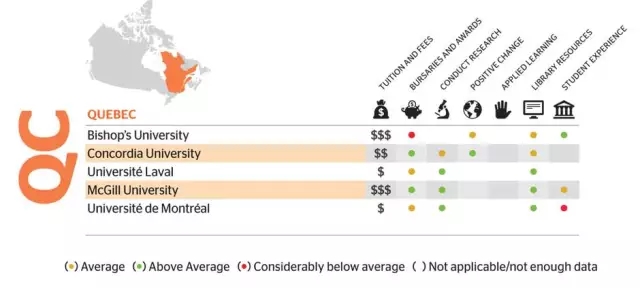 加拿大環(huán)球郵報(bào)發(fā)布了今年的大學(xué)報(bào)告,通過(guò)對(duì)學(xué)生的調(diào)查問(wèn)卷,針對(duì)童鞋們關(guān)心的7個(gè)方面進(jìn)行了對(duì)比:學(xué)費(fèi)、獎(jiǎng)學(xué)金、研究、發(fā)展、實(shí)踐、圖書(shū)館和學(xué)生體驗(yàn),將大學(xué)的水平分為3個(gè)水平:平均;偏上;偏下。來(lái)看看加拿大童鞋們心中,各省大學(xué)哪家強(qiáng)吧~