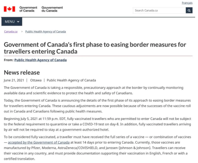 加拿大聯(lián)邦政府6月21日宣布重開國門,從7月5日起、完全接種了疫苗的加拿大公民和永久居民進入加拿大可以不必隔離,這是加拿大聯(lián)邦政府實施放松入境措施的第一階段。