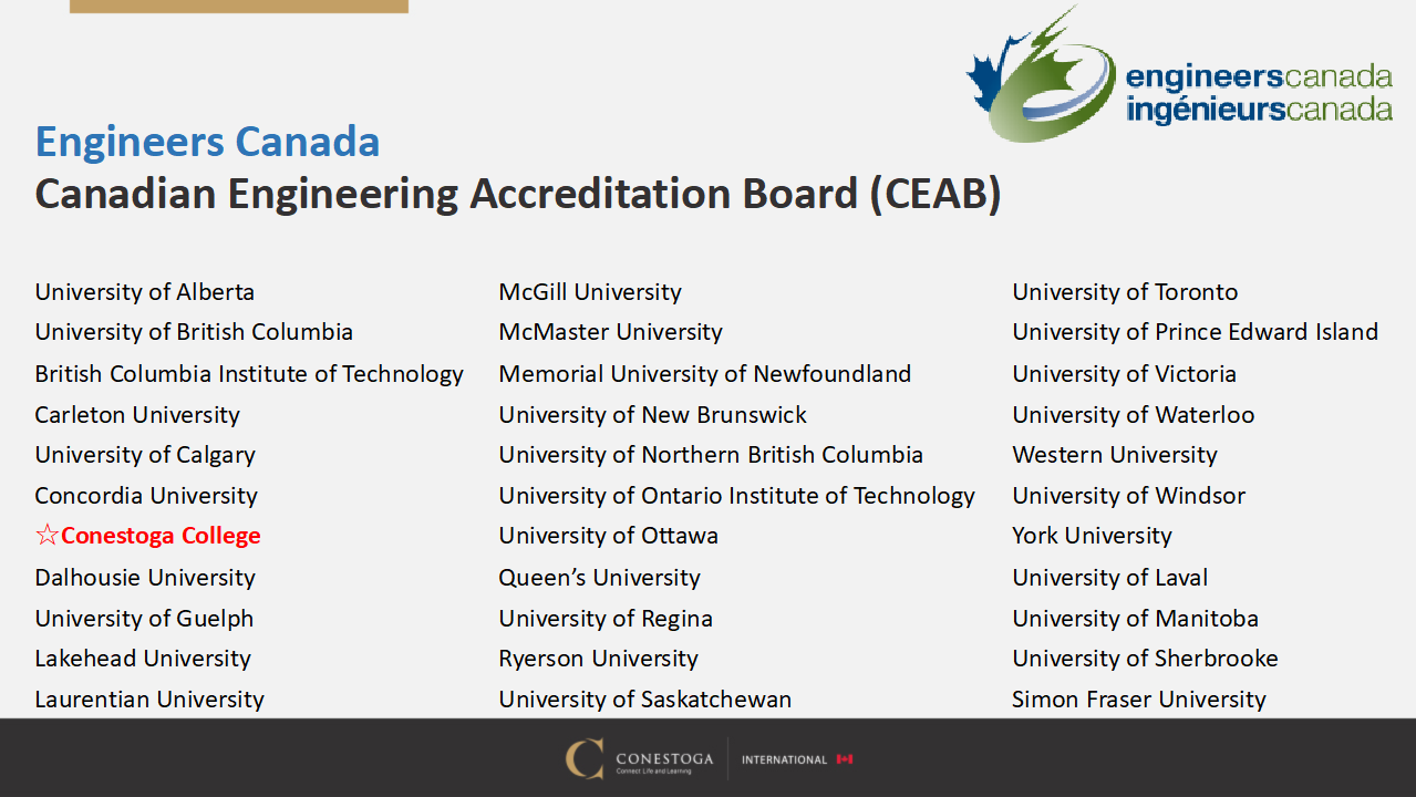 CEAB:加拿大工程師認(rèn)證協(xié)會(huì),作為加拿大工程領(lǐng)域最高級(jí)別的認(rèn)證。全加拿大學(xué)院當(dāng)中只有兩所理工學(xué)院通過(guò)此專業(yè)認(rèn)證,康尼斯托加理工學(xué)院是其中之一,并且也是安省里唯一的學(xué)院。