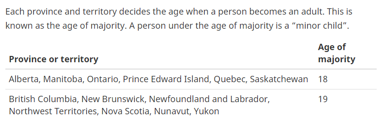 | 18歲成年的省份 | 阿爾伯塔省、曼省、安省、愛德華王子島省、魁省、薩省 |