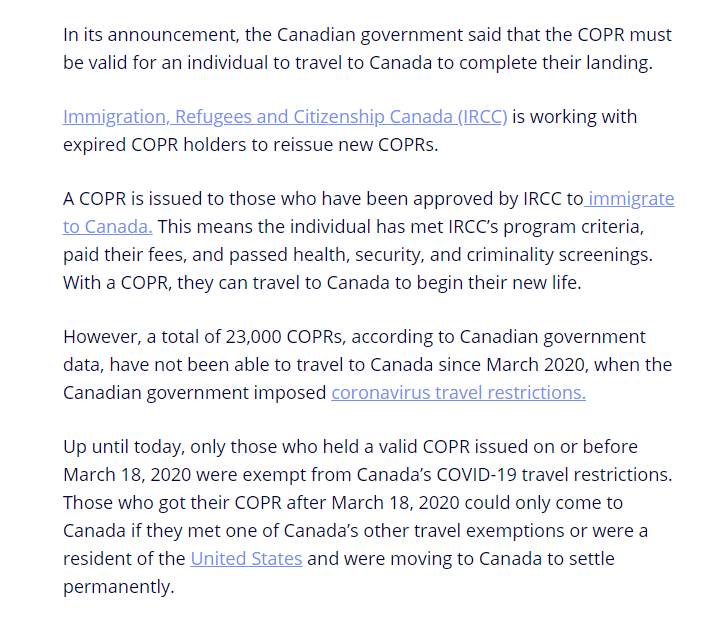很多持有COPR的人員是不符合被豁免入境的情況的,所以一直無(wú)法前往加拿大登陸,由此也造成了COPR文件過(guò)期。