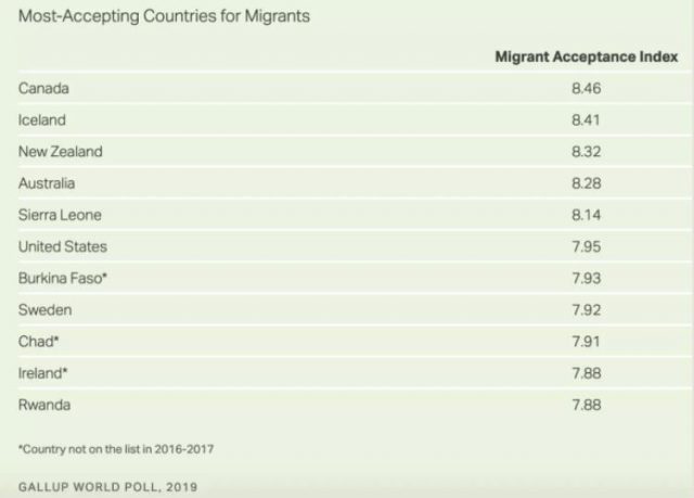 相比于其他發(fā)達(dá)國(guó)家,加拿大人對(duì)移民的接受程度高是有目共睹的。以民意調(diào)查而聞名的績(jī)效管理咨詢(xún)公司Gallup,曾在去年進(jìn)行了一次大規(guī)模的民意調(diào)查。