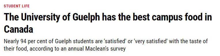 同時(shí)圭爾夫大學(xué)也可以說(shuō)是加拿大留學(xué)生們的吃貨天堂,被麥考林雜志評(píng)為加拿大大學(xué)飲食第一名~在這里飲食選擇非常豐富,有17個(gè)大小食堂,各種風(fēng)格的飲食,西餐,中餐,日式,意式,印度菜,中東菜一應(yīng)俱全。學(xué)校同時(shí)還提供不同飲食習(xí)慣的選擇,比如素食,去乳糖,無(wú)麩質(zhì)食品等。