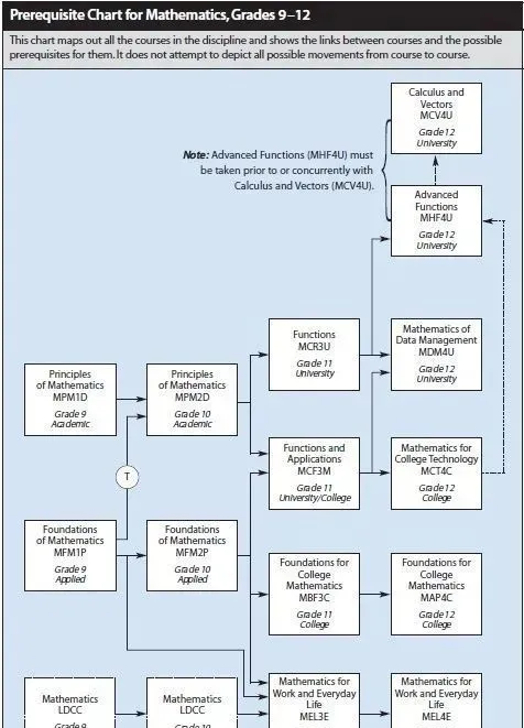 從9年級到12年級的數(shù)學(xué)課程,我們可以通過安省教育部提供的這張流程圖來了解一下。